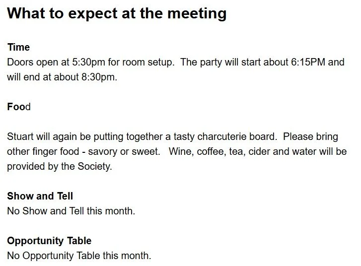 We meet on the second Wednesday of the month at 6pm at the Napa Senior Center at 1500 Jefferson Street, Napa